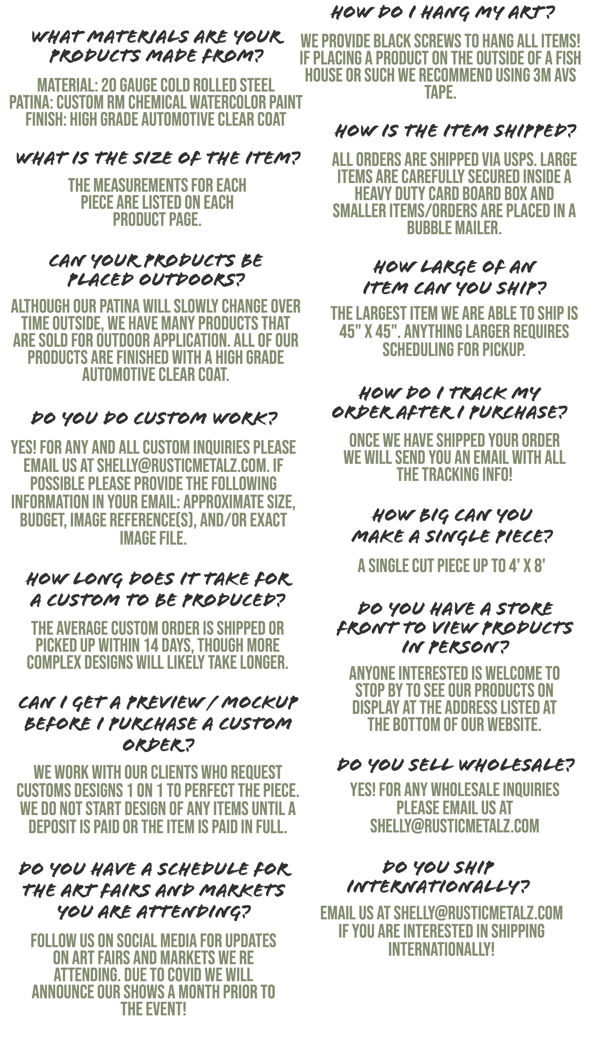 We do not have a store front, but you are welcome to come by our home to checkout our assortment of products in our custom trailer made for transporting our displays to shows but also so you can shop comfortably!